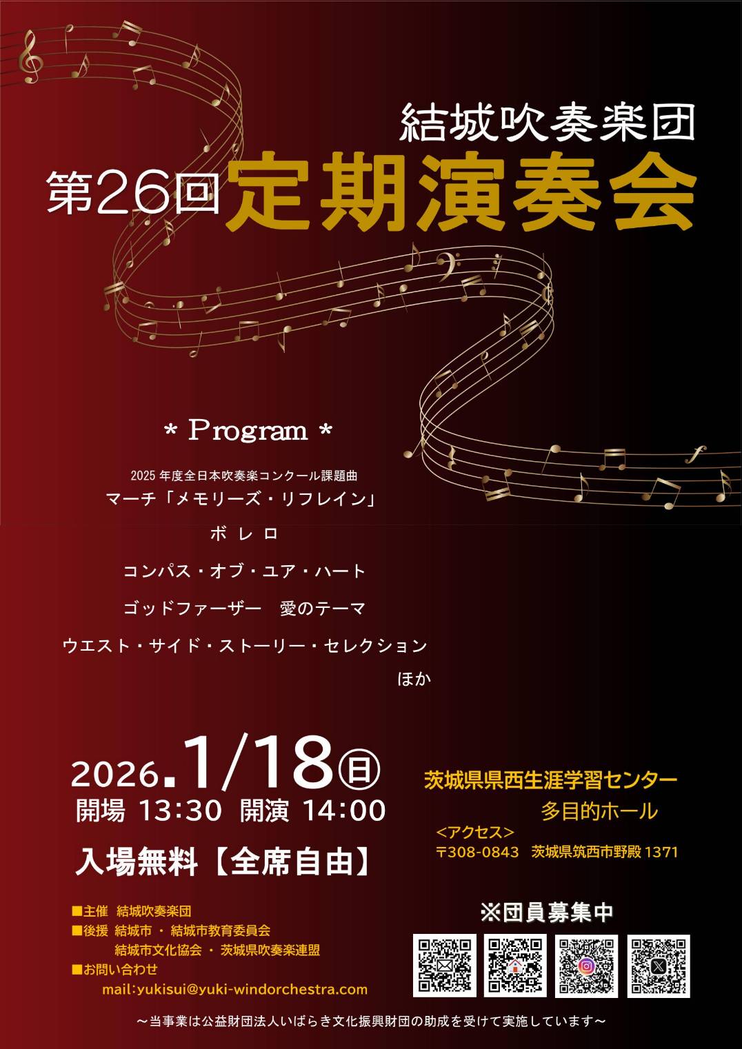 これからの活動 ○2026年 ・第26回定期演奏会 1月18日(日)開場13時30分、開演14時00分 茨城県県西生涯学習センター(茨城県筑西市野殿1371)多目的ホール (公財)いばらき文化振興財団の文化活動事業費助成金を受けて実施します。 みなさまのご来場、お待ちしております。 ※活動予定が変更・中止される場合もございますので、ご了承下さい。